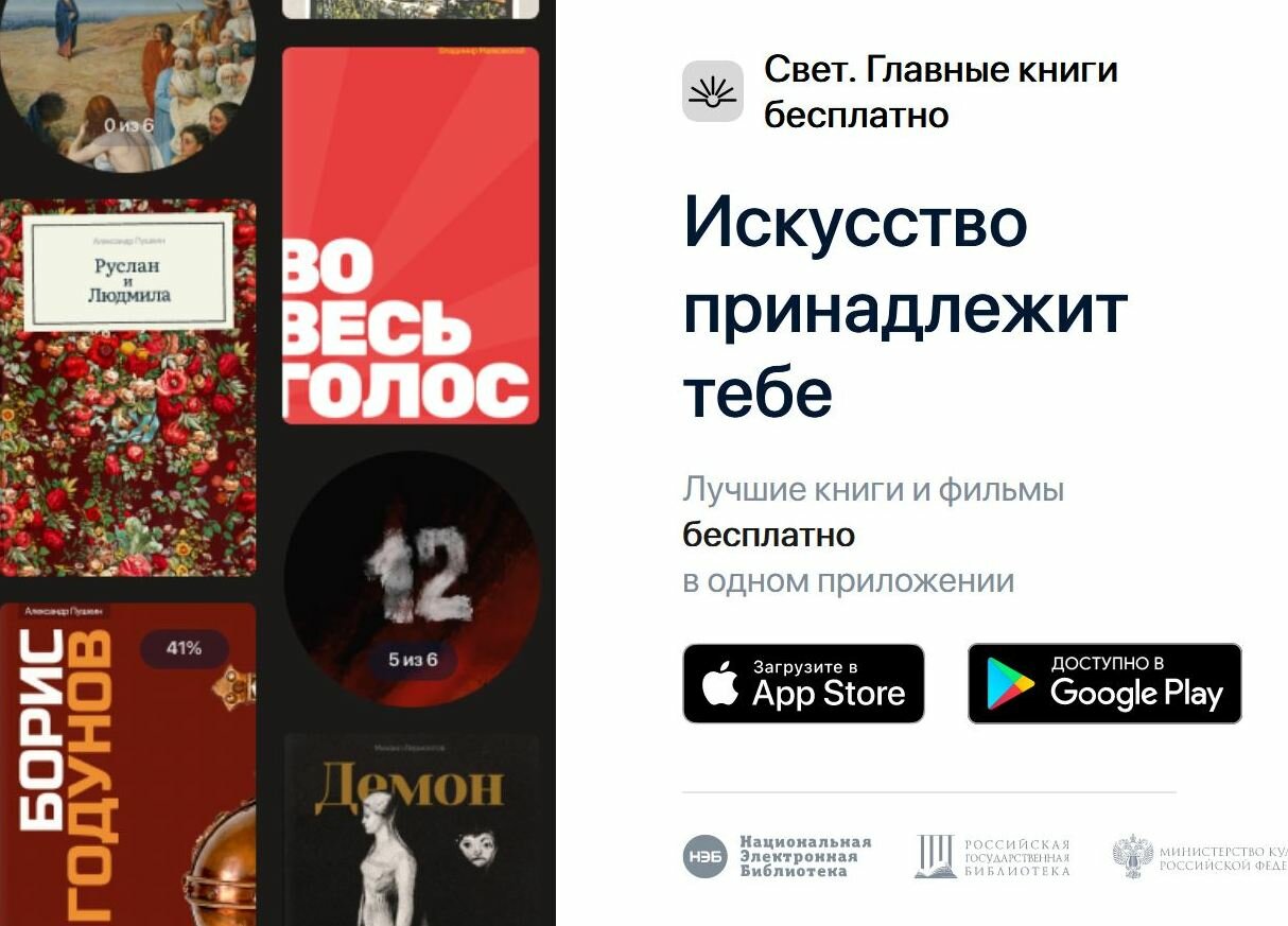 Национальная электронная библиотека при поддержке Минкультуры России выпустила новое мобильное приложение для чтения «Свет», предоставляющее учащимся удобный и свободный доступ к «золотому фонду» литературы, а также фильмам и спектаклям (оно доступно в App Store и Google Play, https://svetapp.rusneb.ru).