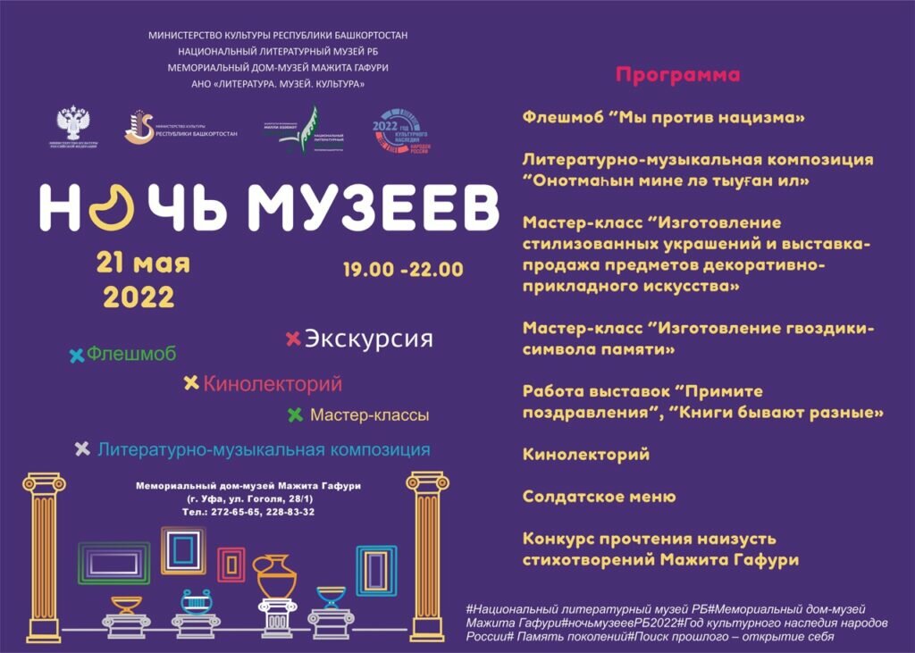 Приглашаем Вас 21 мая 2022 года на Всероссийскую акцию «Ночь музеев». В этот вечер запланированы к проведению такие мероприятия, как музыкально-литературная композиция «Пусть не забудет меня Родина!», выставка «Примите поздравления», мастер-классы «Изготовление стилизованных украшений, гвоздики-символа памяти», «Роспись по камню», открытие выставки «Книги бывают разные», выставка-продажа товаров декоративно-прикладного искусства, игры военных лет для детей и взрослых, конкурсы стихотворений, «Рисуем на асфальте», концерт студентов вокального отделения УГИИ им.З.Исмагилова, кинолекторий, флешмоб «Мы против нацизма». Также для посетителей музея будет предложено солдатское меню. Участники конкурсов будут награждены призами. Начало мероприятий в 19.00.