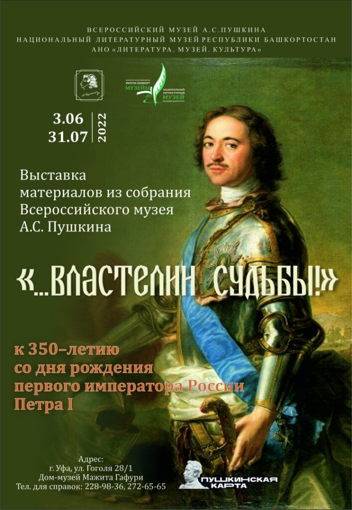 3 июня Национальный литературный музей Республики Башкортостан презентует в Мемориальном доме-музее Мажита Гафури (ул.Гоголя, 28/1) выставку «Властелин судьбы», подготовленную к 350-летию Петра I сотрудниками Медиацентра Всероссийского музея А. С. Пушкина, г. Санкт-Петербург. Выставка, созданная на основе оцифрованных материалов из собрания Всероссийского музея А. С. Пушкина, представляет работы художников XVIII-XX веков, портреты Петра I и его современников, виды Петербурга, художественные интерпретации произведений поэта.
